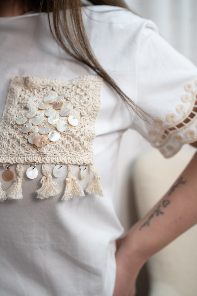 Ein hochwertiges T-Shirt im Boho Style  mit Häkeldetails.