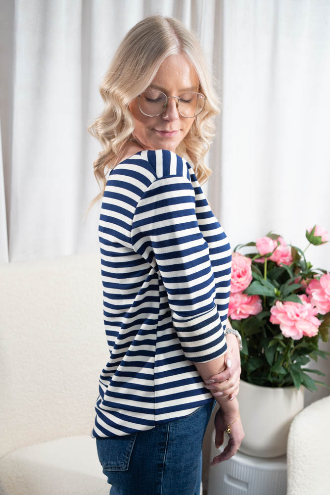 Schönes elastisches Sweatshirt aus Baumwolle mit Streifen. Die Säume und der Halsausschnitt sind mit einer offenen Naht abgekettelt.