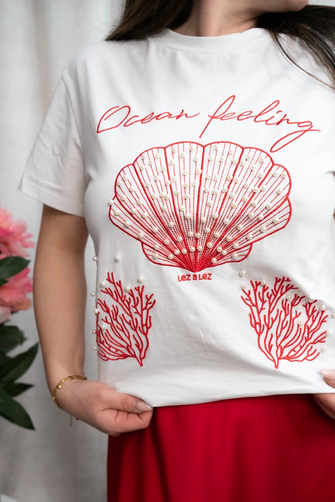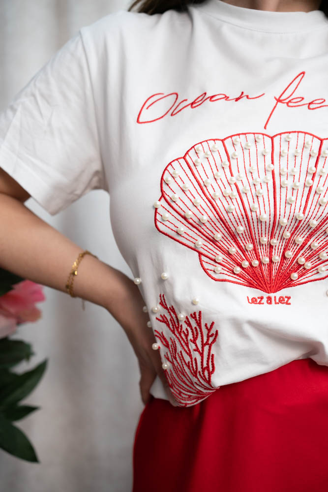 Ein hochwertiges T-Shirt mit eine Bestickung aus Muscheln & Korallen mit eingestanzten Perlen.