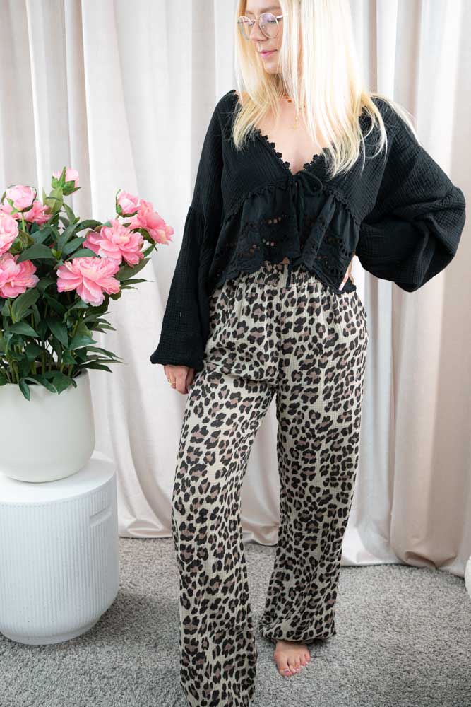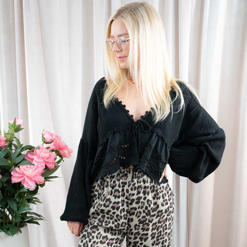 Lässig geschnittene Musselin Bluse mit Ballonärmeln und zartem Spitzensaum. Vorn zum Binden, der V-Ausschnitt ist mit dekorativer Blütenspitze verziert.