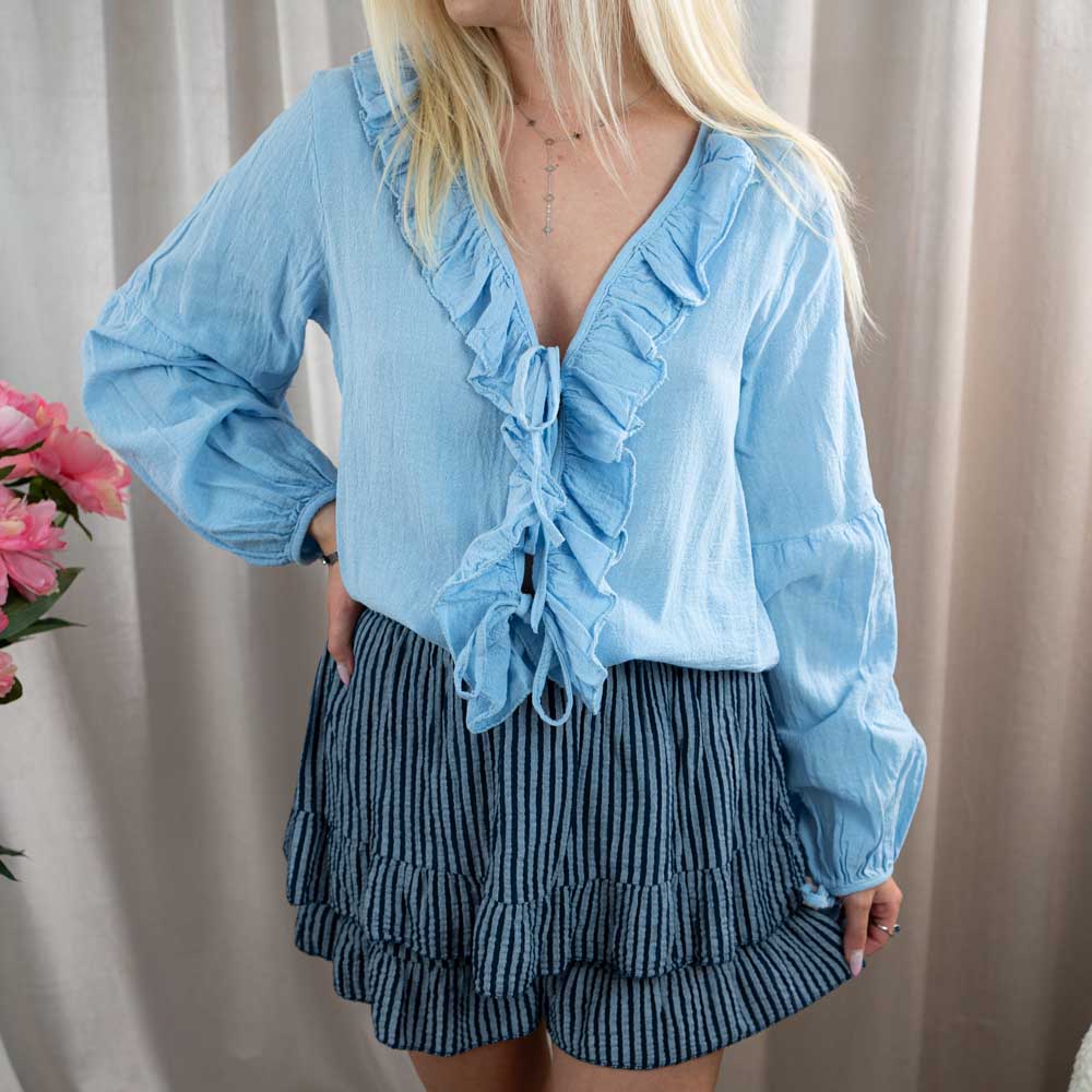 Lässig geschnittene Baumwoll Bluse mit Ballonärmeln und süßen Volants.. Vorn zum Binden.