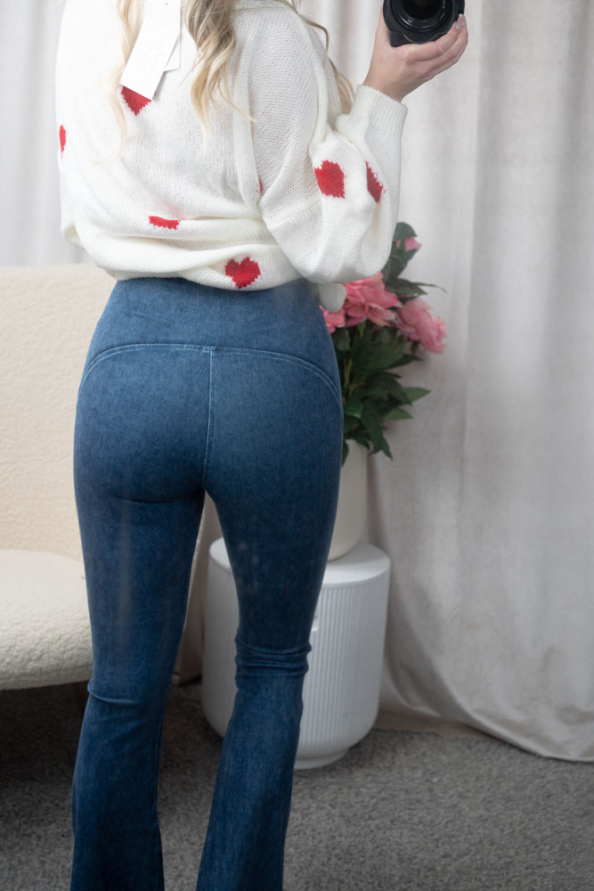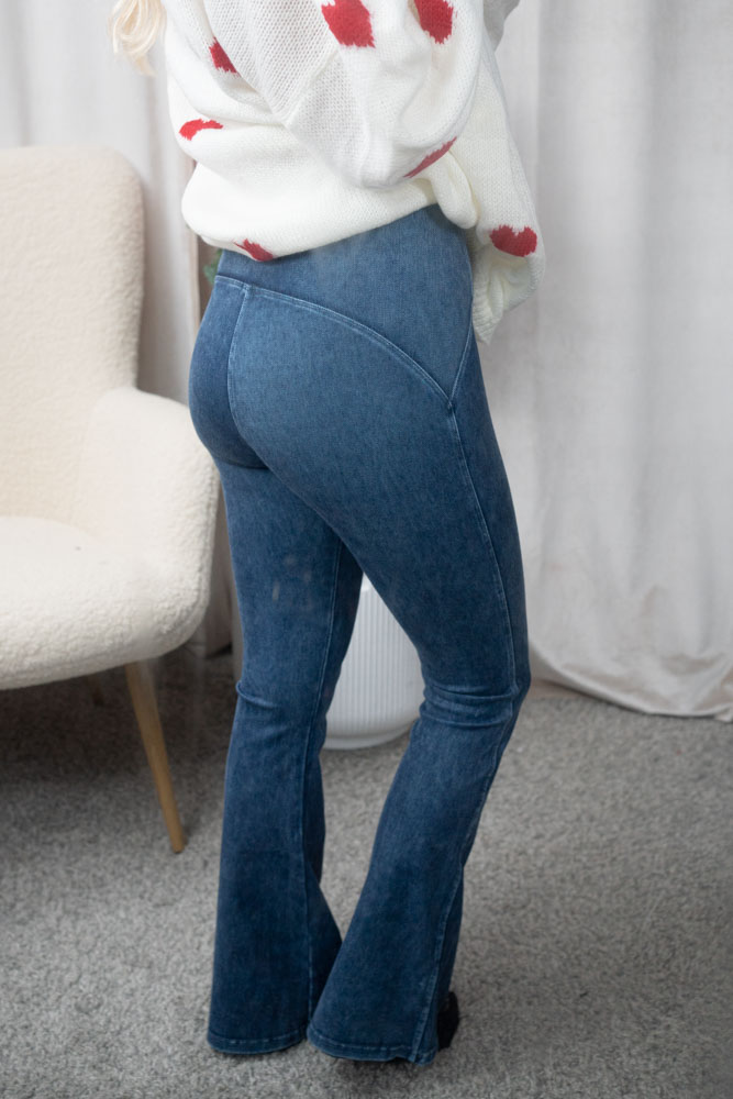 Unsere Schlaghose Shaping Jeans / Leggings vereint Style und Funktion in Perfektion. Das hochwertige Material schmiegt sich wie eine zweite Haut an und sorgt für einen straffen, formenden Effekt. Der extra feste Bauchbund bietet optimalen Halt, formt die Taille und zaubert eine schöne Silhouette. Skinny oberhalb des Knies, Schlaghose unterhalb.