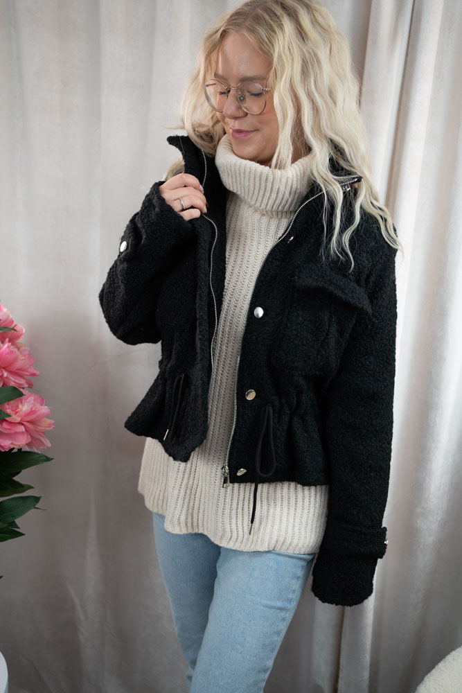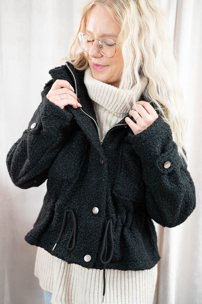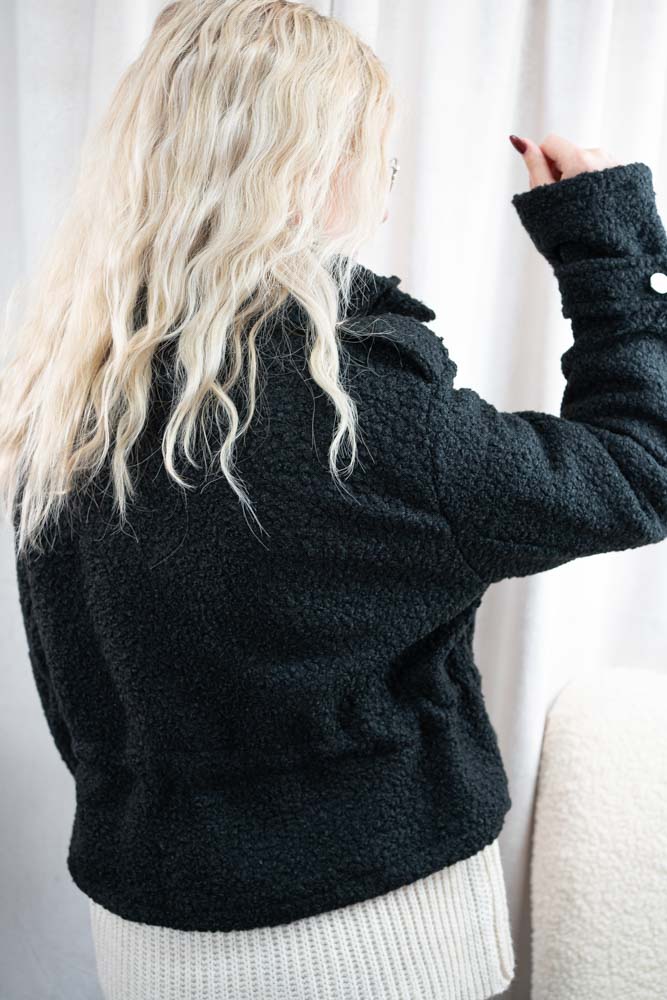 Super schöne Übergangsjacke aus Boucle Stoff mit Reißverschluss und silbernen Knöpfen sowie aufgesetzten Taschen und Manschettendetails - hergestellt in Italien.