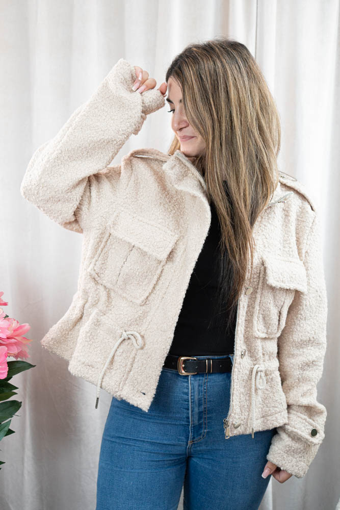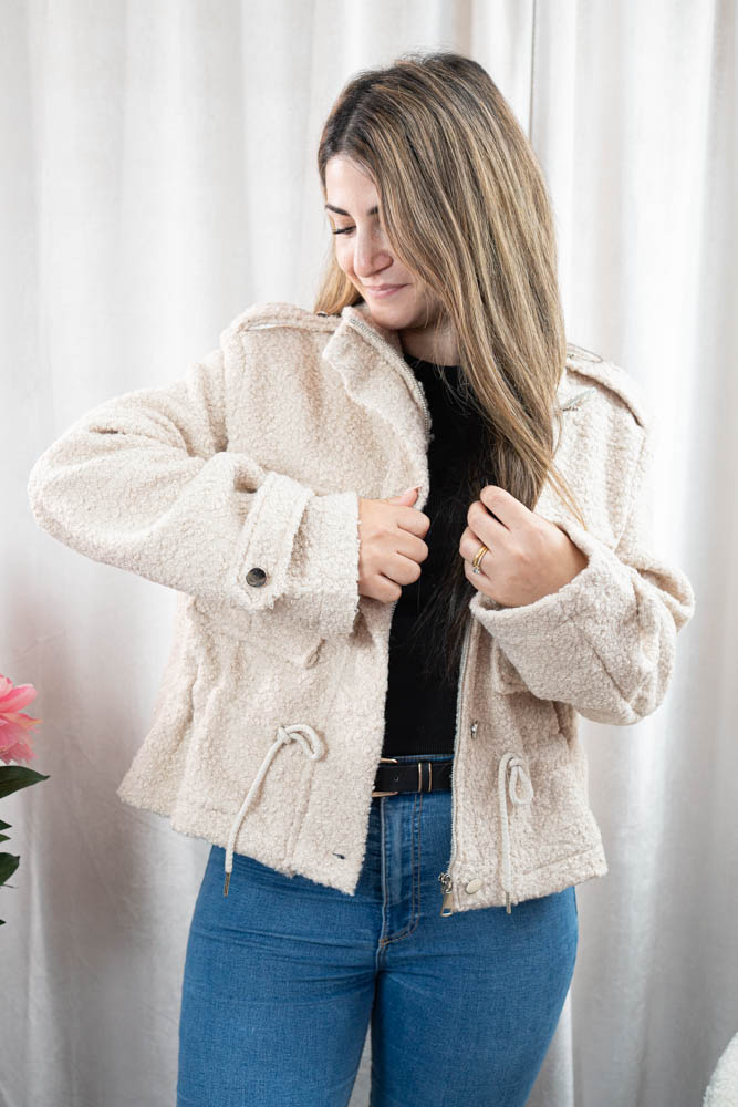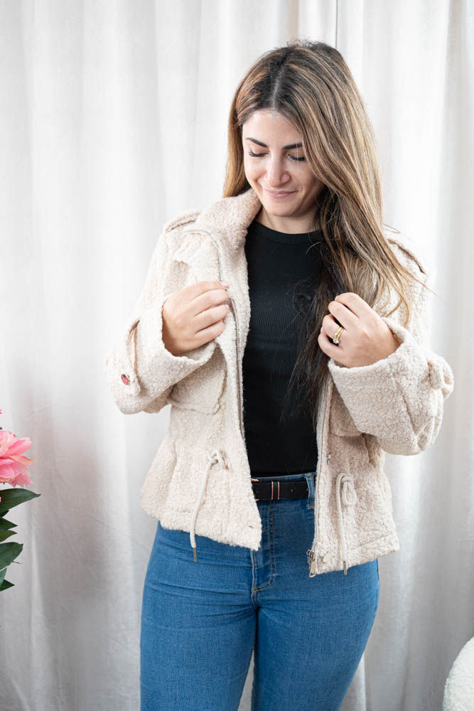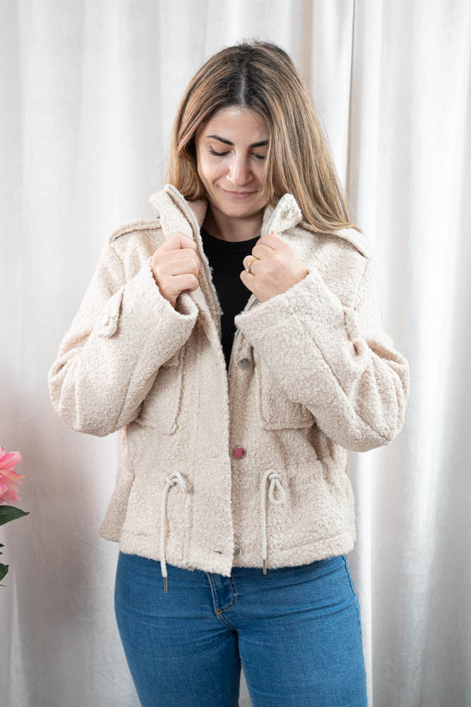 Super schöne Übergangsjacke aus Boucle Stoff mit Reißverschluss und silbernen Knöpfen sowie aufgesetzten Taschen und Manschettendetails - hergestellt in Italien.