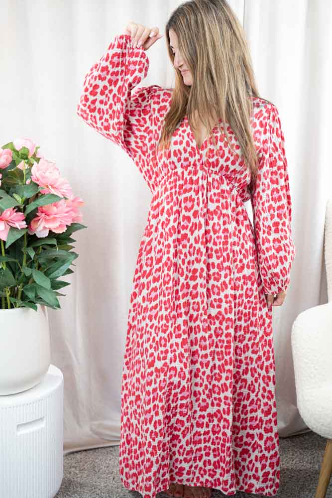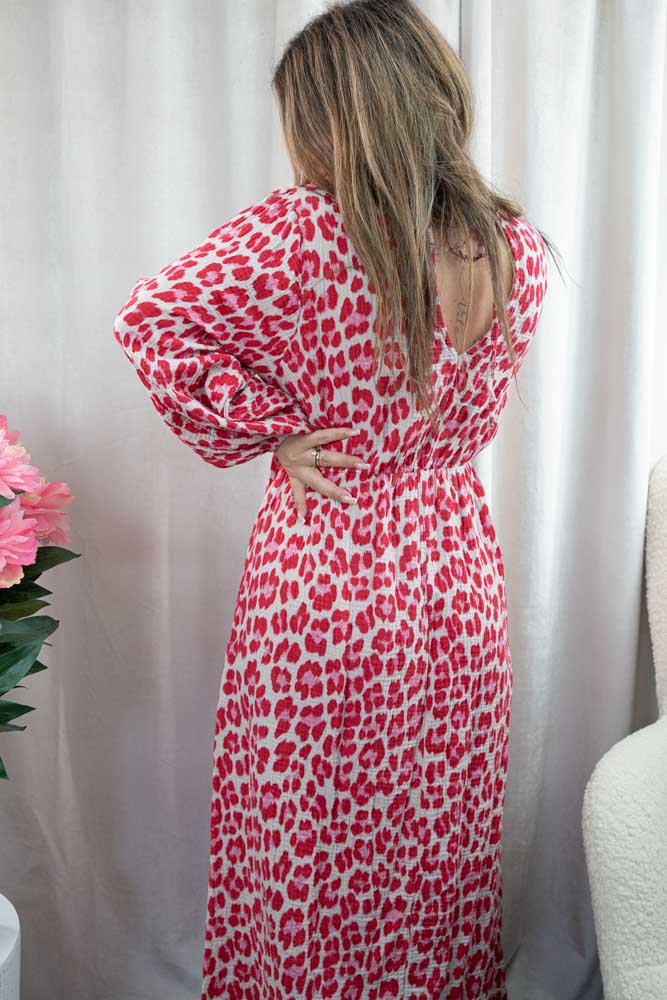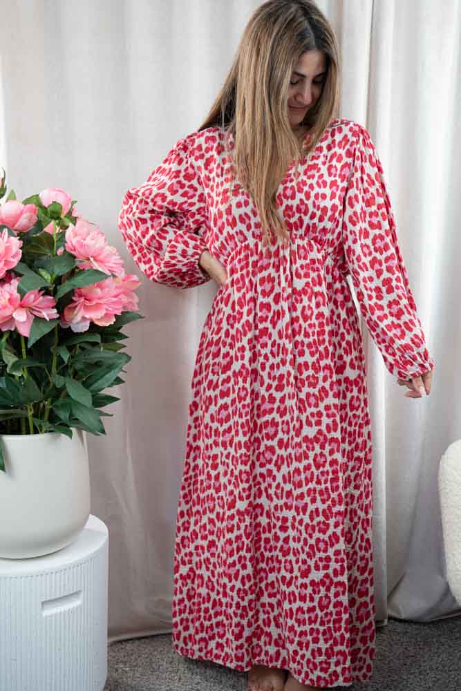 Feminines Musselinkleid in Maxilänge und Langarm mit Leoprint, tailliert mit Gummi und Bindeverschluss am Nacken.