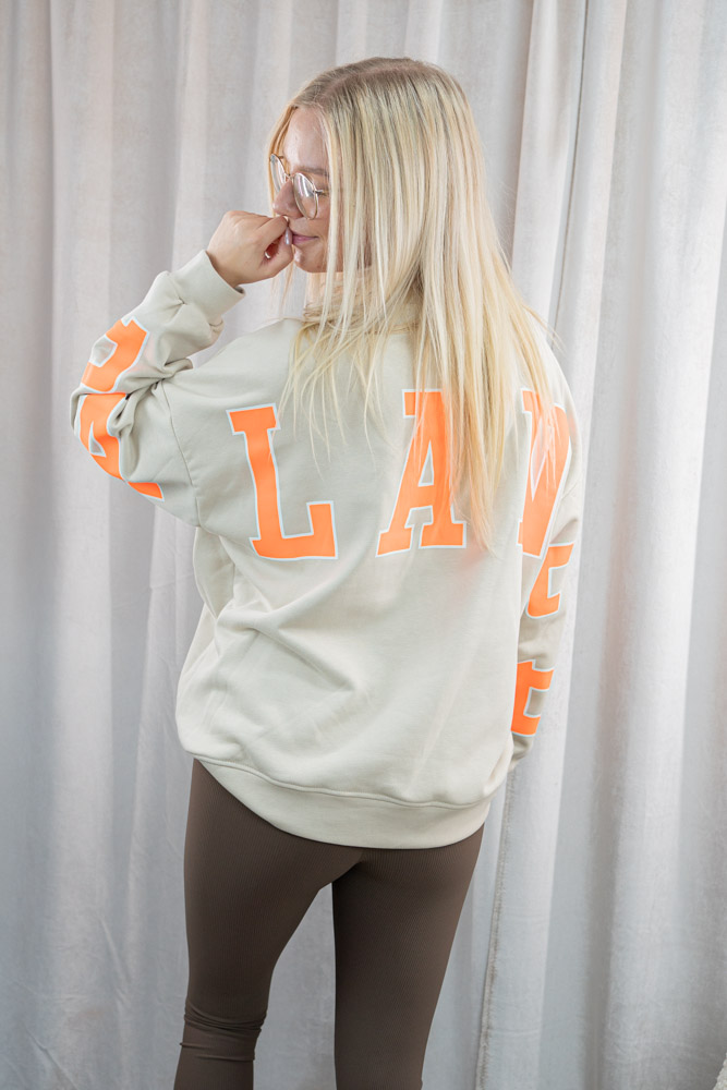 Lässig geschnittener Sweater mit neon orangener Aufschrift "Balance" und überschnittenem Ärmel - hergestellt in Italien.