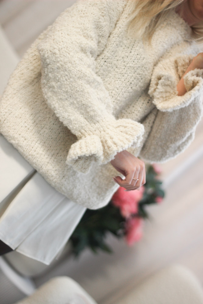 Bouclé Pullover mit Rüschenärmeln natur
