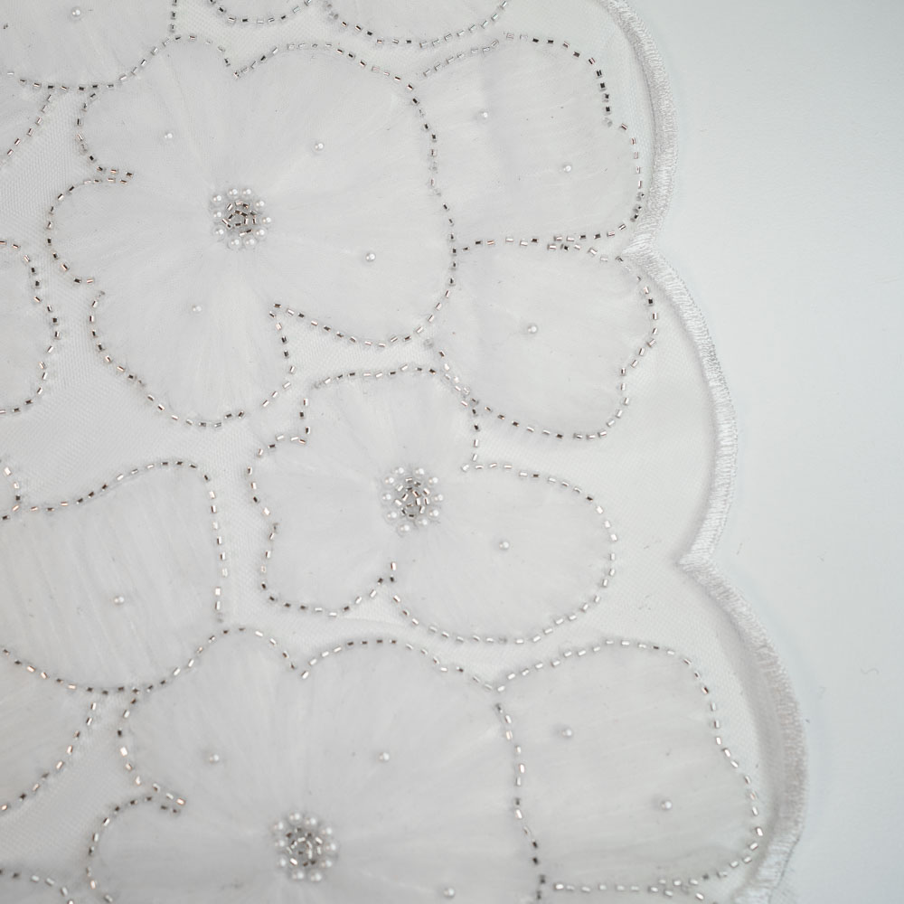 Diese hochwertige italienische Brautspitze ist kunstvoll mit Tüllblüten, sowie Perlenstickerei, verziert. Die Spitze besitzt eine wunderschöne beidseitige Bogenkante.