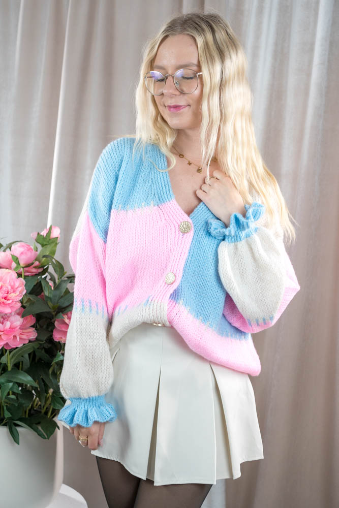 Super softer Oversized Strick Cardigan mit süßen Rüschenärmeln und hochwertigen Goldknöpfen zum Schließen.