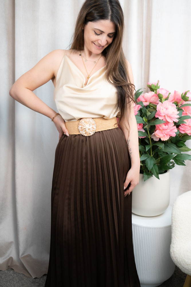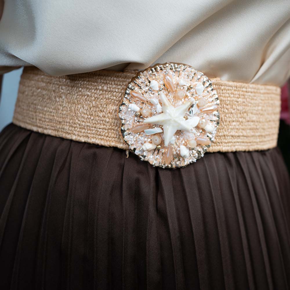 Ein wunderschöner elastischer Taillengürtel. Die goldene Schnalle ist mit Perlen und echten Muscheln verziert.