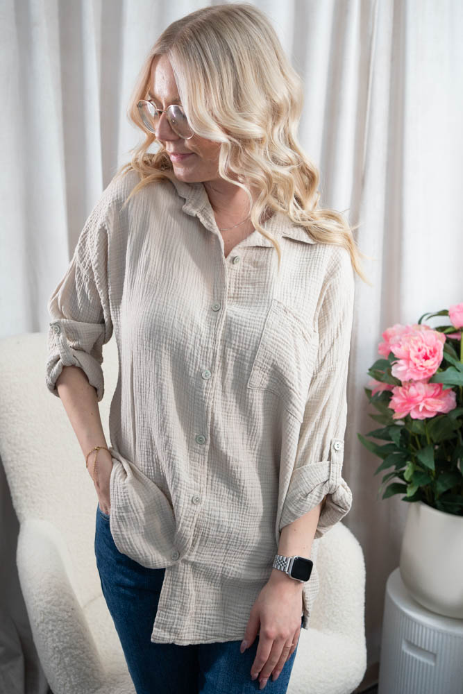 Schöne Bluse mit Ärmeln zum Hochkrempeln und Perlmuttknöpfen.