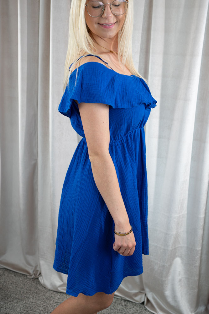 Schönes Offshoulder Musselin Kleid mit Trägern und Volants am Ausschnitt.