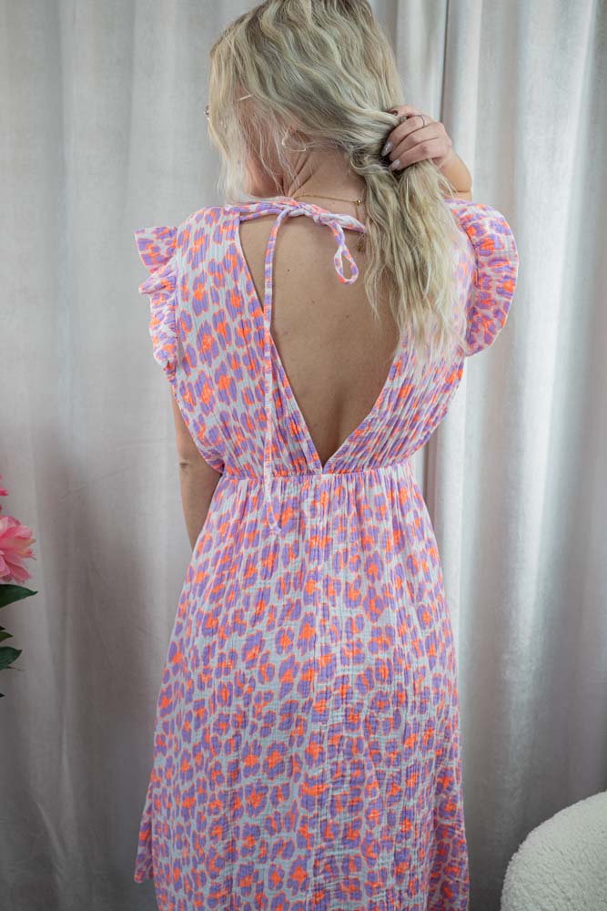 Feminines Musselinkleid mit Ärmel, Gummizug an Taille und Ärmel sowie V-Ausschnitt.