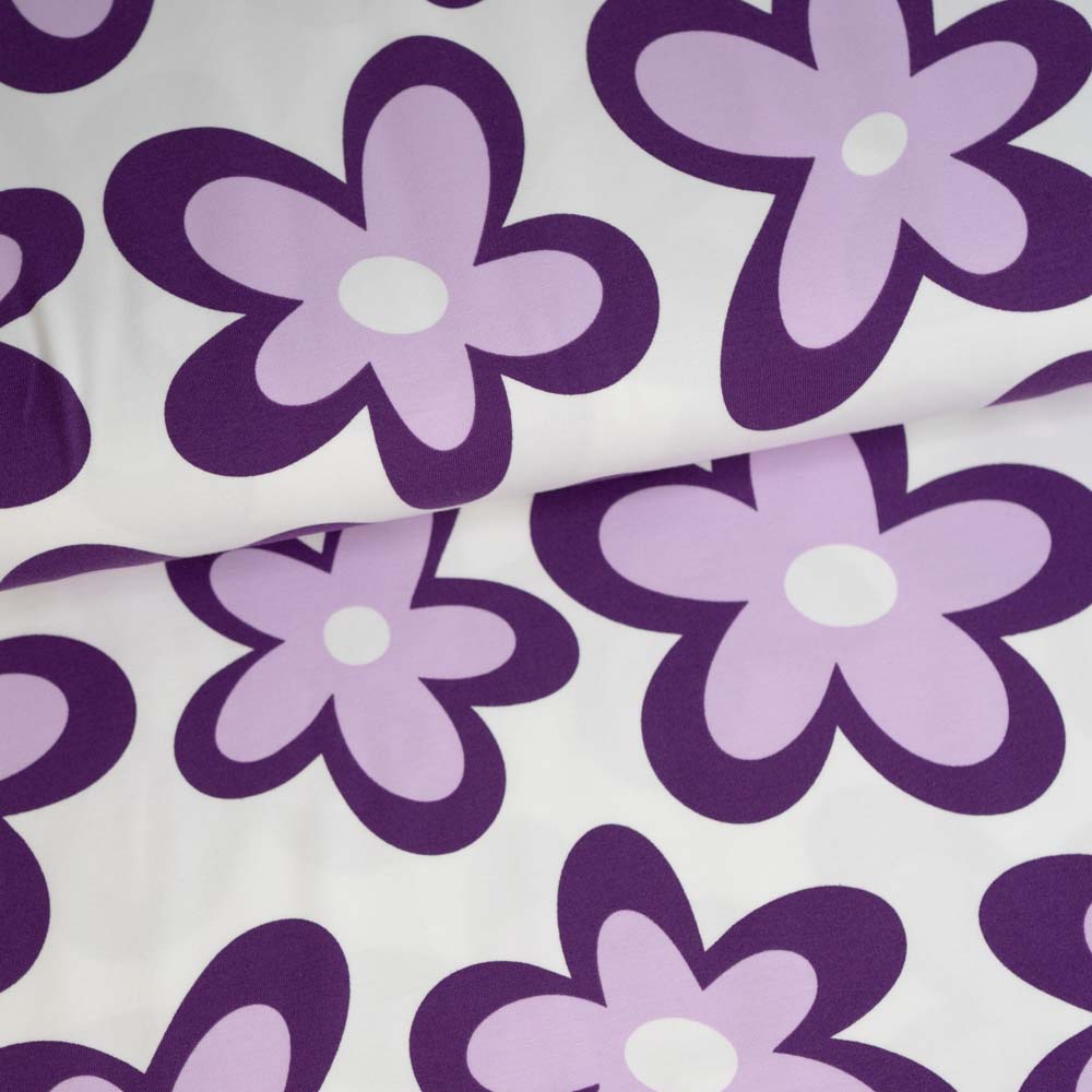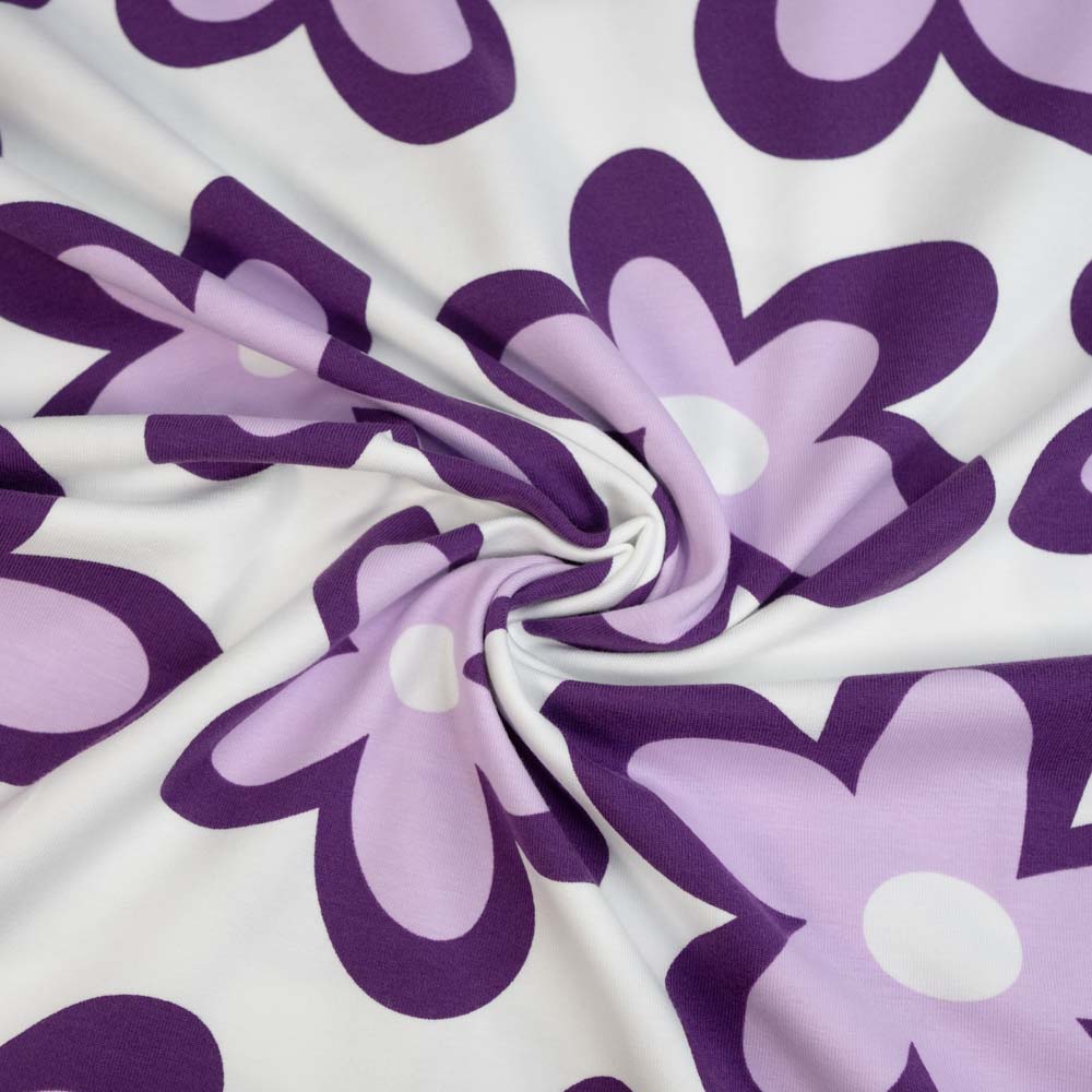 Baumwolljersey lila Blümchen ecru