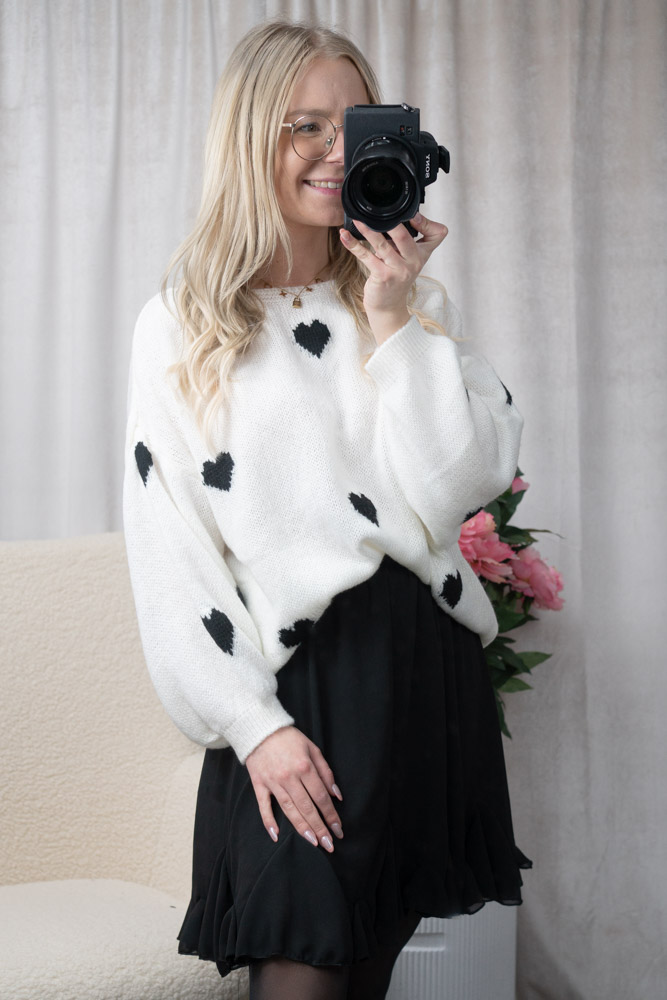 Schöner und sehr weicher Streifen Pullover mit Sabrina Ausschnitt und eingestrickten Herzen.