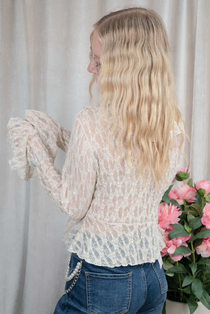 Transparentes und elastisches Spitzenshirt mit langen Ärmeln und Volants zum Binden.