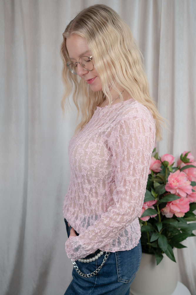 Transparentes und elastisches Spitzenshirt mit langen Ärmeln.