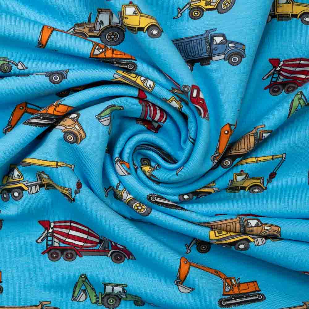 French Terry Sweat Baustellenfahrzeuge aqua hell