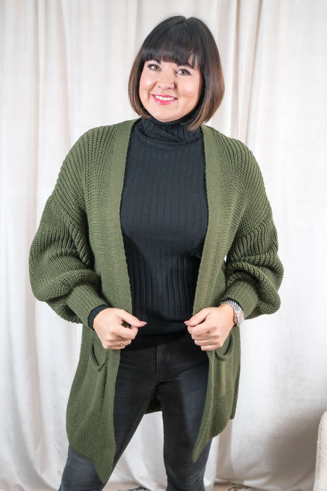 Weicher langer Strickcardigan mit Puffärmeln und Taschen.