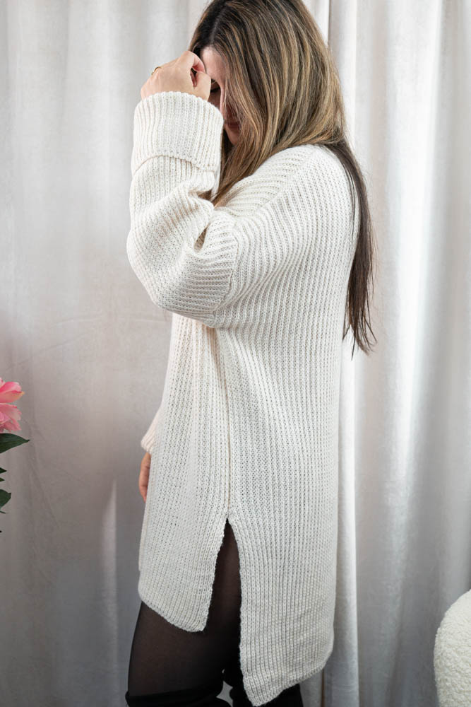 Schönes Strickkleid in Vokuhila Länge mit seitlichem Schlitz und Ärmel mit Krempeleffekt. Auch als Pullover tragbar.