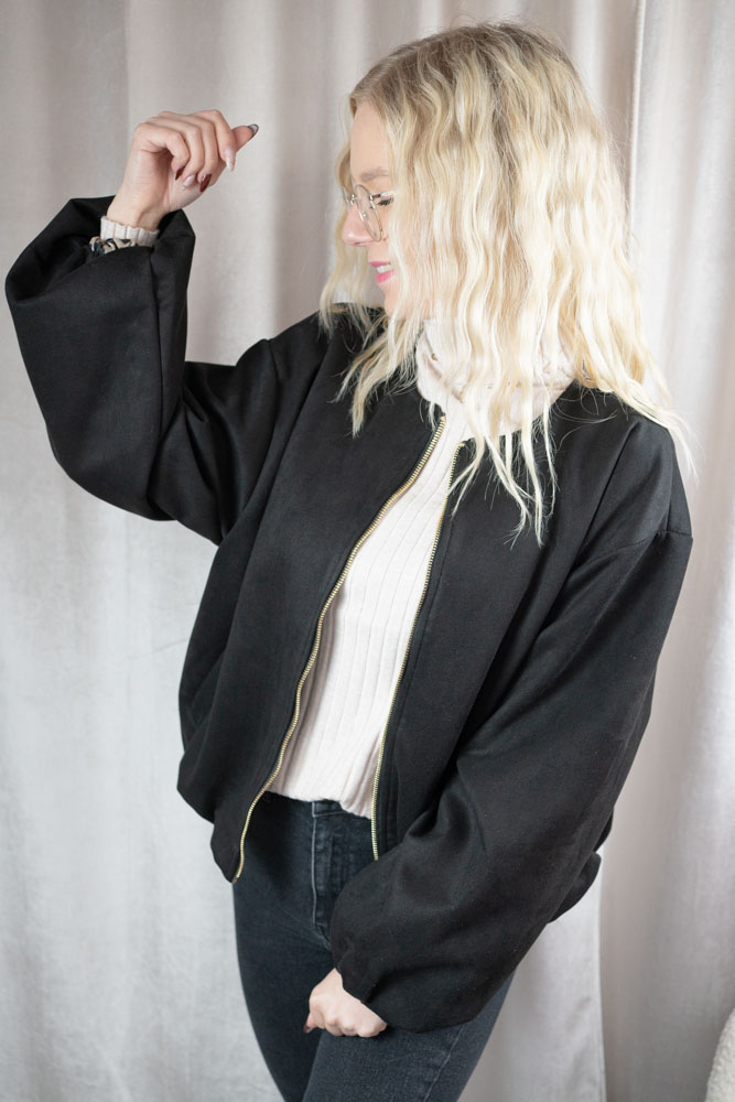 Super schöne Übergangsjacke aus Velourleder Imitat mit goldenem Reißverschluss und seitlichen Eingriffstaschen. Sie ist gefüttert mit Leo Futterstoff und besitzt ein leichtes Gummi an Ärmel und Bund - hergestellt in Italien.